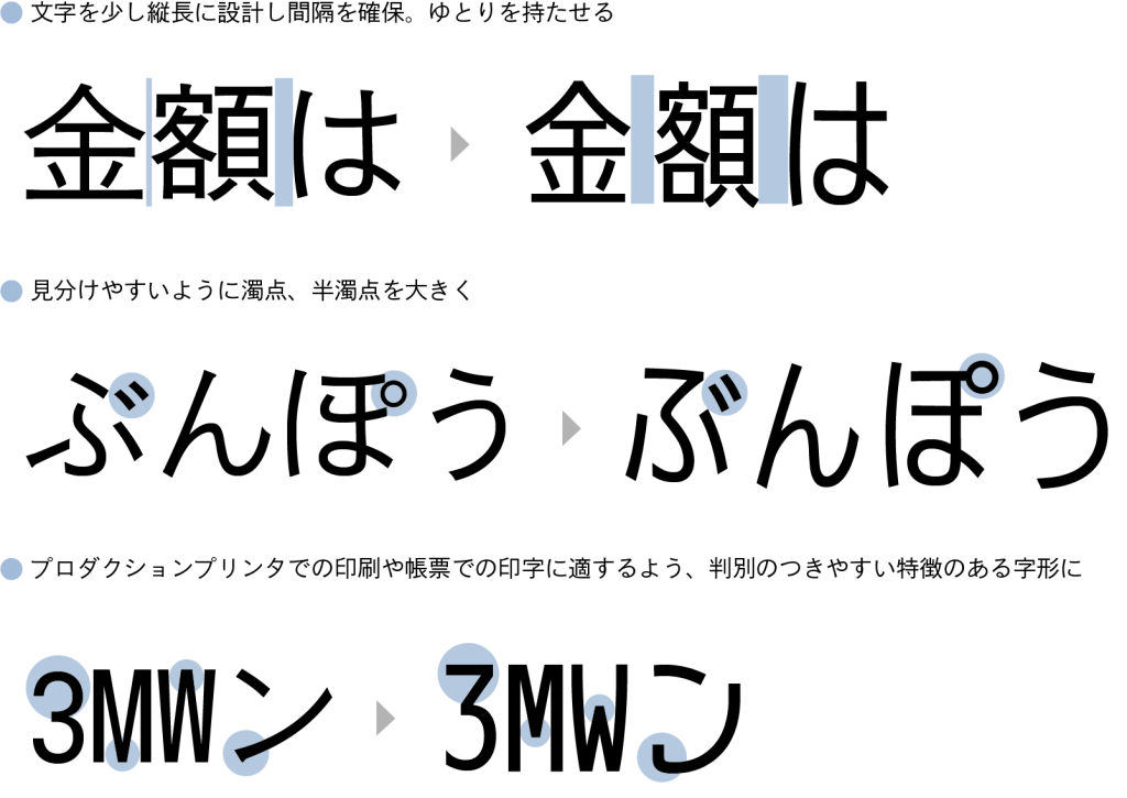 文字を少し縦長に設計することで横の文字との間隔を十分に確保、それでいてしっかり大きく見えます。さらに濁点などの細部を大きくしたり英数字を見分けやすい形状に調整することで、優れた視認性・判読性を実現した汎用性の高い書体です。