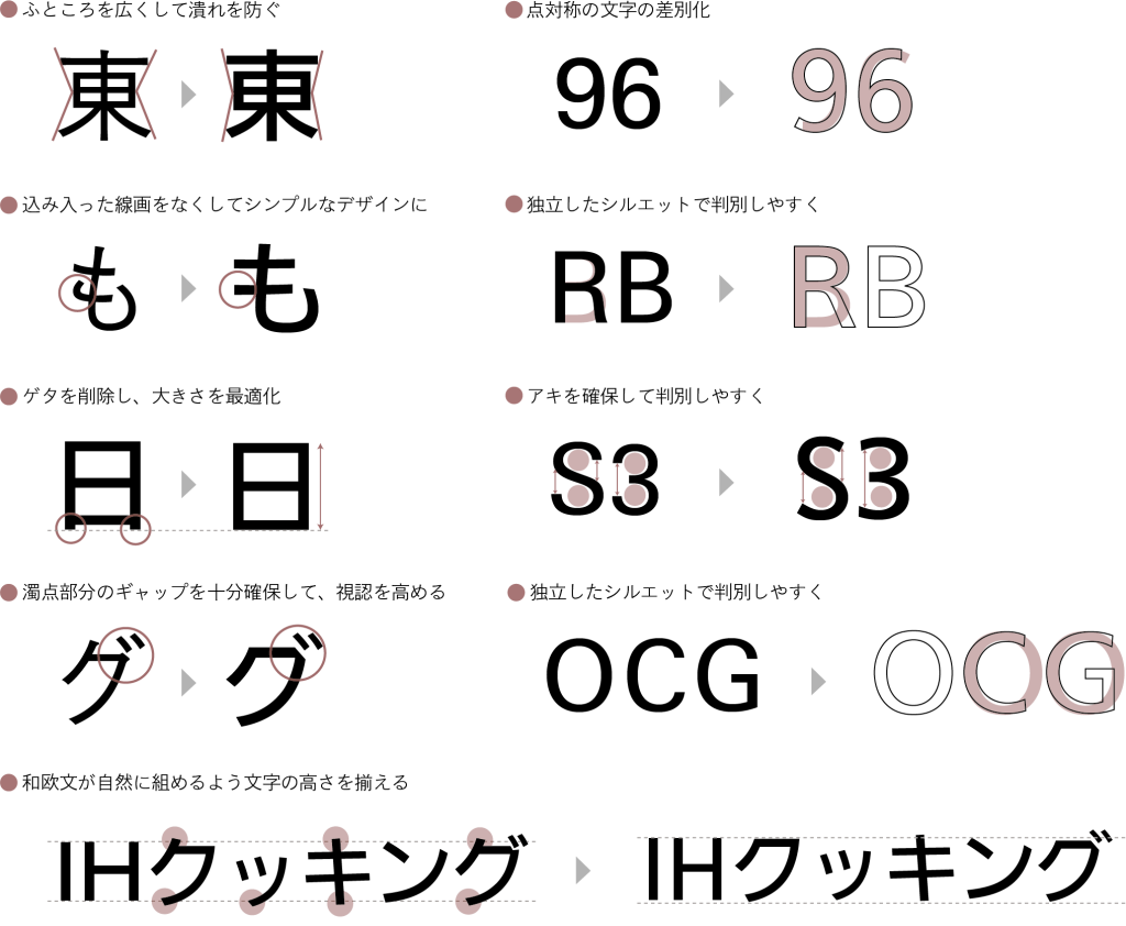 誤読を防ぎ読みやすさを向上させるために、デザインにいくつもの工夫がされています。