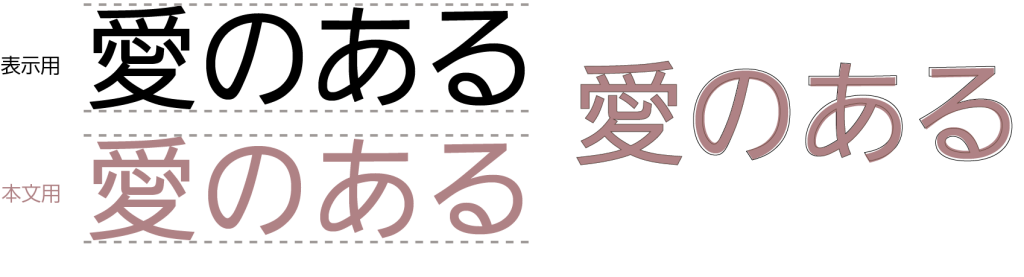 「表示用」は視認性と判読性に重点を置いて仮名や欧文が大きくデザインされています。「本文用」は長文での読みやすさを追究し、「表示用」よりも仮名や欧文が小さく設計されています。