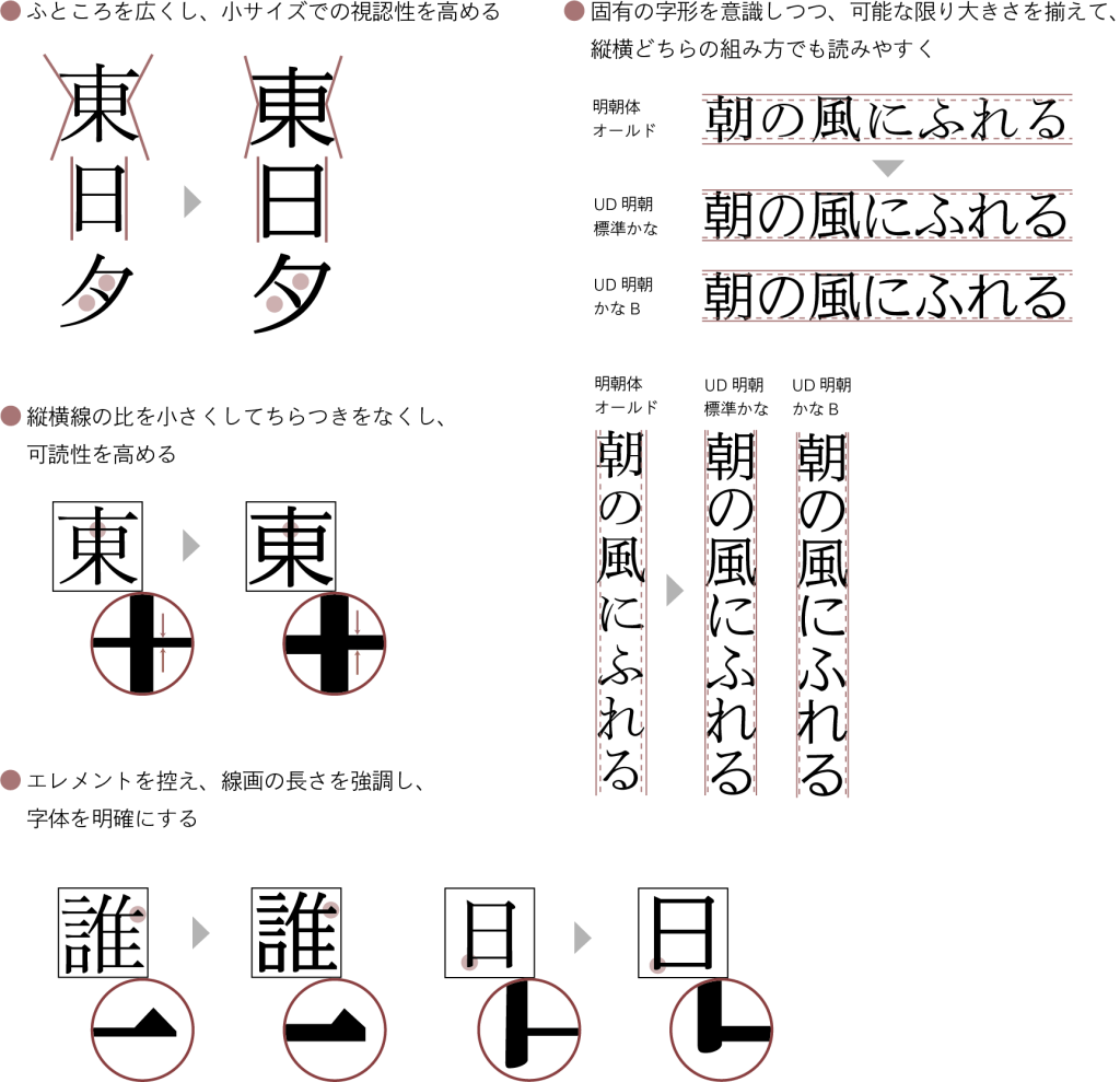 UD 明朝は誤読を防ぎ読みやすさを向上させるために、デザインにいくつもの工夫がされています。