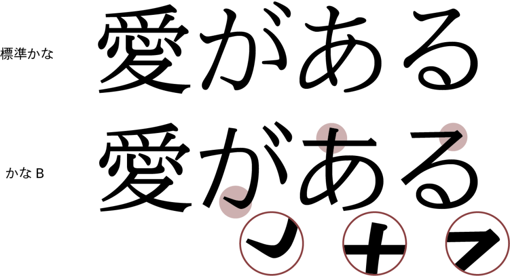 UD 明朝の読みやすさはそのままに、「かなB」は直線的な線画に漢字のようなエレメントを持たせたモダンなデザインとなっています。