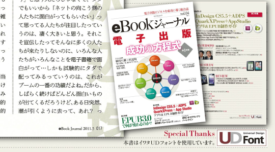 | 事例紹介文 | 株式会社 毎日コミュニケーションズ発行の電子出版ビジネスを成功に導く総合誌『eBookジャーナル』に「イワタUD明朝」「イワタUDゴシック」が採用されました。